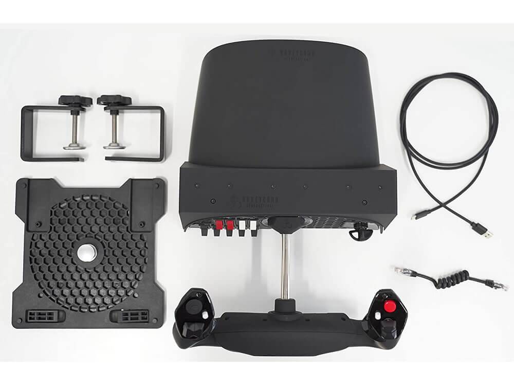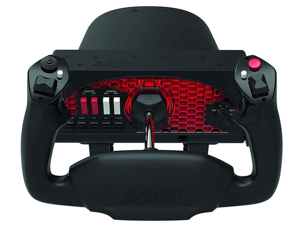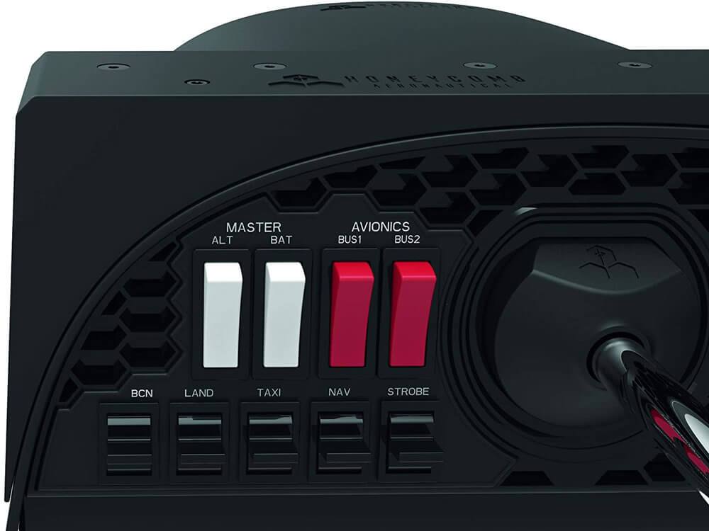 While developing the Alpha Flight Controls, Honeycomb took into account the wishes of flightsimmers. The shaft of the yoke is completely made out of steel, moving over a length of 15 centimeters, and turning 180 degrees to both sides. For a flightsim yoke in this price range this is exceptional, because other yokes often have a limited turning range. You can find a switch panel on the controller’s base, with an ignition switch and a panel with avionics and light switches. Of course, the Honeycomb Yoke has different two-way switches and a pov hat switch.
