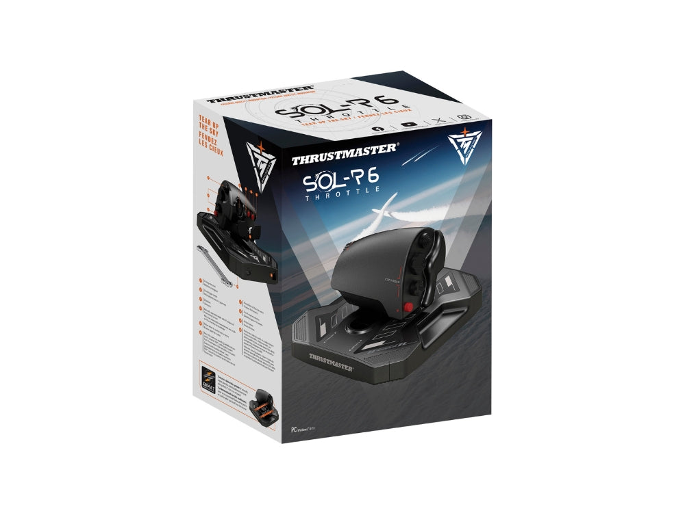 Compatible with PC (Windows 10 / 11), the Sol-R 6 Throttle connects easily via USB-C and is automatically recognized in Microsoft Flight Simulator and Digital Combat Simulator. You can connect Thrustmaster TFRP Rudder Pedals to the rear RJ12 port to expand your setup. Pre-drilled mounting holes match the TWCS layout, allowing installation on a Thrustmaster Flying Clamp, desktop, or cockpit mount for a flexible and versatile flight station. Built for both atmospheric and orbital flight, the Sol-R 6 Throttle delivers the power and precision to master any mission.
